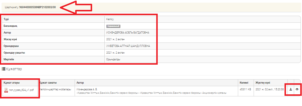 Көрсетілген «Құжатты келісу» терезесінде, тапсырма түрі, басымдығы, құжат авторы, жасалған күні, орындау мерзімі, мәртебесі (статусы) көрсетіледі.