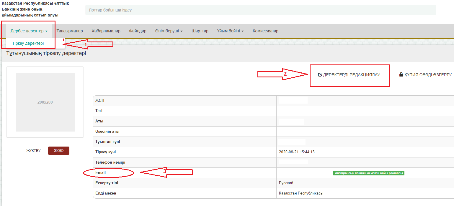 Электрондық поштаның мекенжайын өзгерту үшін, Сізге «Дербес деректер» - «Тіркеу деректері» көрсетілген мәзіріне өтіп, «Пайдаланушының деректерін редакциялау» бөлімінде электрондық пошта мекенжайын өзгерту керек.