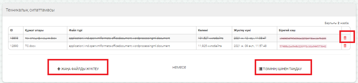 Бұдан әрі «Техникалық ерекше нұсқама» бөлімінде файлды жоюға және қажетті құжатты (файлды) жүктеуге болады.