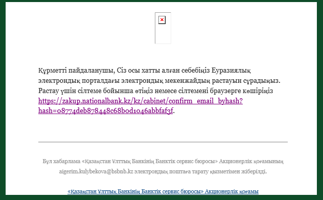 «Электрондық пошта мекенжайыңызды растау нұсқаулары бар көрсетілген электрондық пошта мекенжайына электрондық хат жіберілді» хабарландыруын көрсетеді. Назар аударыңыз! Электрондық поштаны растаудың болмауы Пайдаланушының Порталда одан әрі жұмыс істеуін шектейді.