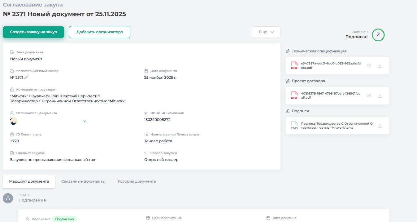 Если при создании документа согласования закупа Инициатор (Автор) не указал Организатора, система позволяет назначить его после этапа подписания (Рисунок 146).