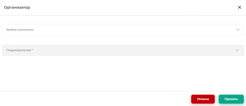 Для добавления организатора необходимо в карточке документа нажать кнопку «Ещё» и выбрать действие «Добавить организатора». Система откроет модальное окно «Добавление организатора» с выпадающим списком (Рисунок 147). Нажать кнопку «Принять» для сохранения выбора. После подтверждения выбранный сотрудник назначается организатором закупа и отображается в карточке документа как ответственное лицо.