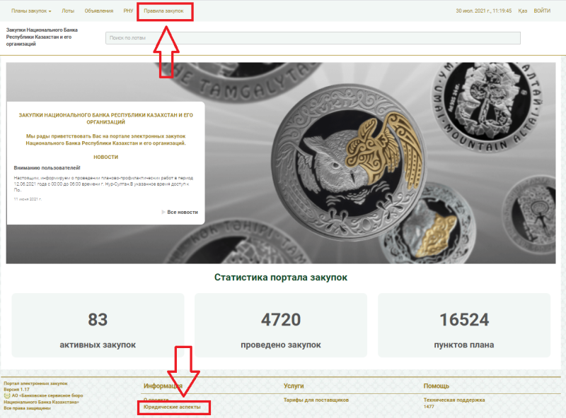 Правила приобретения товаров, работ и услуг Национальным Банком Республики Казахстан, его ведомствами, организациями, входящими в его структуру, и юридическими лицами, пятьдесят и более процентов голосующих акций (долей участия в уставном капитале) которых принадлежат Национальному Банку Республики Казахстан или находятся в его доверительном управлении, и аффилированными с ними юридическими лицами, утвержденные постановлением Правления Национального Банка Республики Казахстан от 27.08.2018 года № 192 размещены в разделах «Правила закупок» и «Юридические аспекты» на главной странице портала закупок.