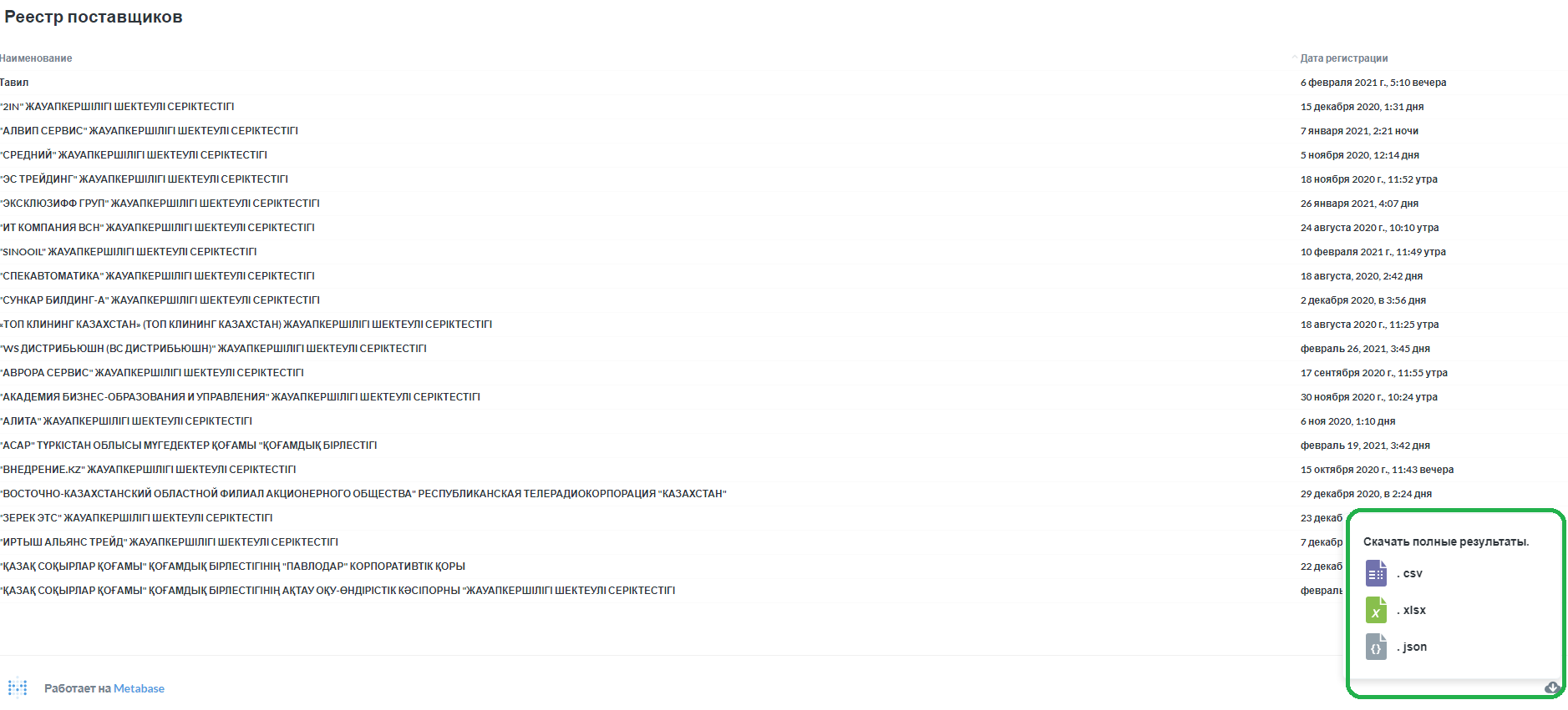 Для поиска поставщика, у заказчика имеется возможность упорядочить потенциальных поставщиков по алфавиту либо по дате регистрации поставщика, а также возможность выгрузки файла в соответствующем формате.