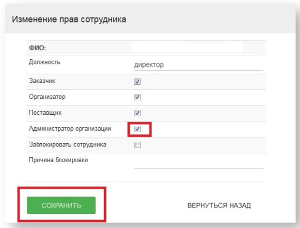 Добавить сотруднику роль «Администратор организации», далее нажать на кнопку «Сохранить».