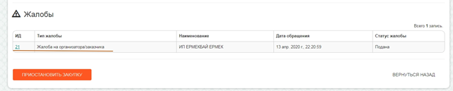 При необходимости приостановки закупки необходимо войти по наименованию закупки и спуститься в нижнюю часть страницы, где можно ознакомиться с жалобой по данной закупке.