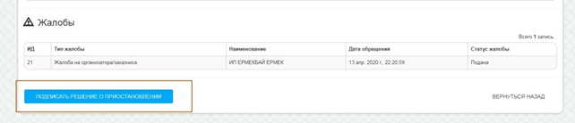 Необходимо подписать решение нажав на кнопку «Подписать решение о приостановлении» и подписать ключом ЭЦП.