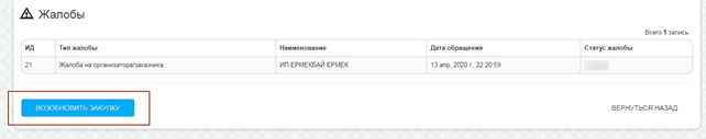 При нажатии на данную кнопку, система отобразит уведомление «Закупка успешно возобновлена».
