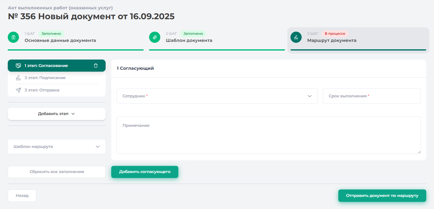 Вкладка «Маршрут документа» предназначена для настройки этапов обработки документа. На этом шаге вы определяете последовательность действий, через которые должен пройти документ, начиная с согласования и заканчивая отправкой (Рисунок 229).