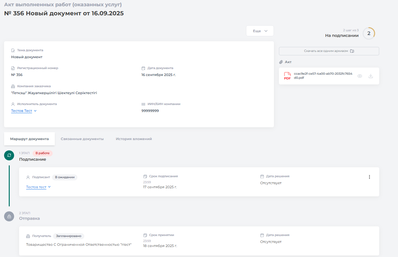 После отправки документа по маршруту, нажав кнопку «Отправить документ по маршруту», система начинает его обработку в соответствии с настроенными этапами — согласование, подписание и отправка. На странице карточки документа отображается окне «Маршрут документа», где отображается информацию по этапам, сотрудников-исполнителей и сроков выполнения. Статус документа автоматически меняется в зависимости от текущего этапа прохождения маршрута (Рисунок 230).