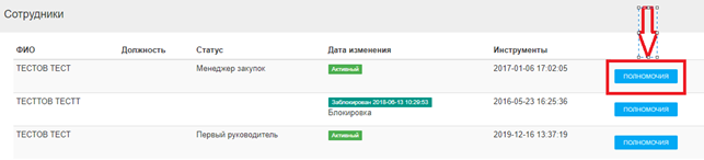 В открывшейся форме необходимо нажать на кнопку Полномочия напротив сотрудника, которому необходимо предоставить права.
