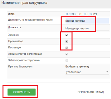 Добавить сотруднику необходимые роли, прописать должность сотрудника на государственном и русском языках и нажать на кнопку «Сохранить».