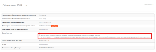 После публикации объявления система отображает сведения о добавленной лицензии в карточке объявления. В карточке объявления отображается признак проведения закупки среди потенциальных поставщиков, имеющих соответствующую лицензию и (или) разрешительный документ, а также код и наименование выбранной лицензии (Рисунок 7).