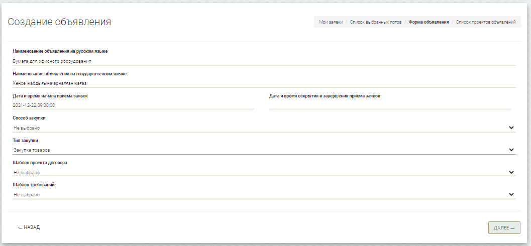 - Наименование объявления на русском языке и государственном языке – система автоматически подтягивает наименование со справочника ЕНСТРУ (имеется возможность корректировки наименования объявления);