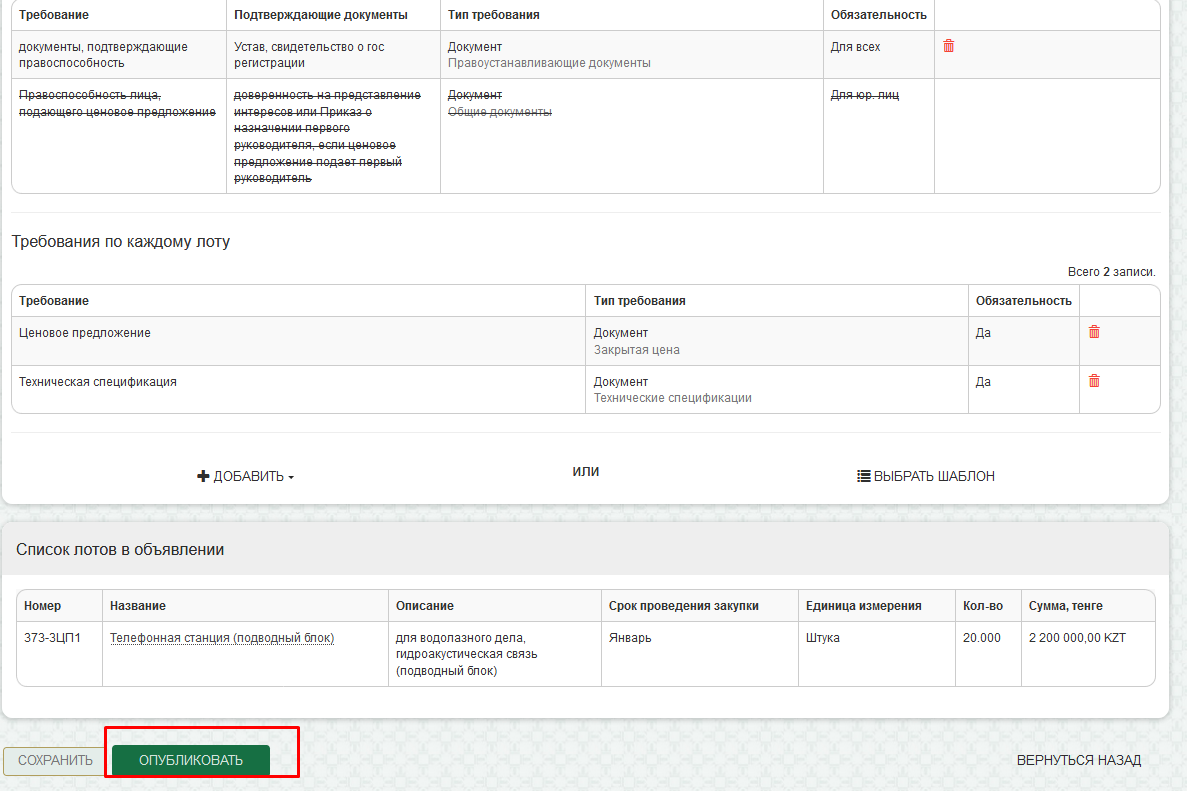 - В требованиях по каждому лоту – заполняются требования, указывается тип требования, категория документов и обязательность требования.