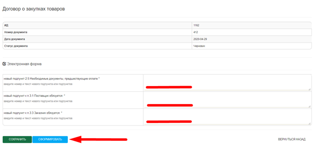 При нажатии на «Наименование проекта договора» отобразится Электронная форма. В Электронной форме необходимо заполнить поля и нажать на «Сформировать»