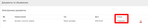 При нажатии кнопки «Сохранить» объявление сохранится со статусом «Проект» для этого необходимо пройти «Закупки – Мои объявления – Проекты объявлений» и может быть опубликовано позже.