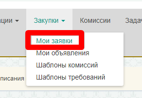 Для создания объявления о закупках способом запроса ценовых предложений, необходимо выбрать в меню «Закупки – Мои заявки»
