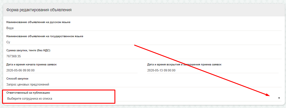 На форме редактирования объявления необходимо выбрать из списка «Ответственный за публикацию».
