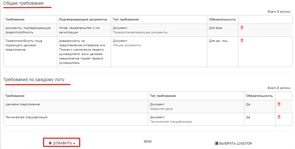 При необходимости добавление требований следует нажать на «Добавить» или удалить требование нажав на знак «Козина»