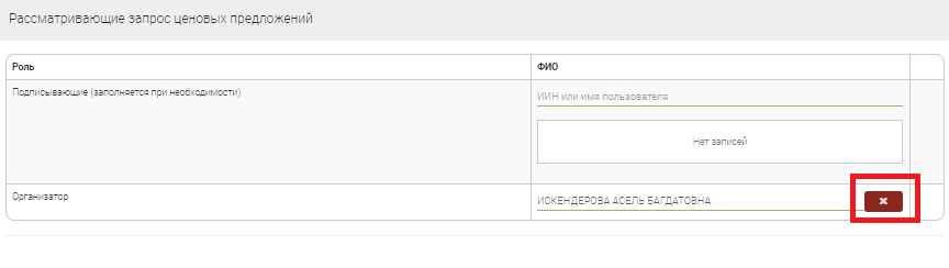 В разделе «Рассматривающие запрос ценовых предложений» (пользователи которые будут рассматривать заявки) могут выступать зарегистрированные на Портале сотрудники (работники) организации Заказчика/Организатора закупки. Для добавления участника осуществите поиск по имени или ИИН участника комиссии в разделе «Рассматривающие запрос ценовых предложений».