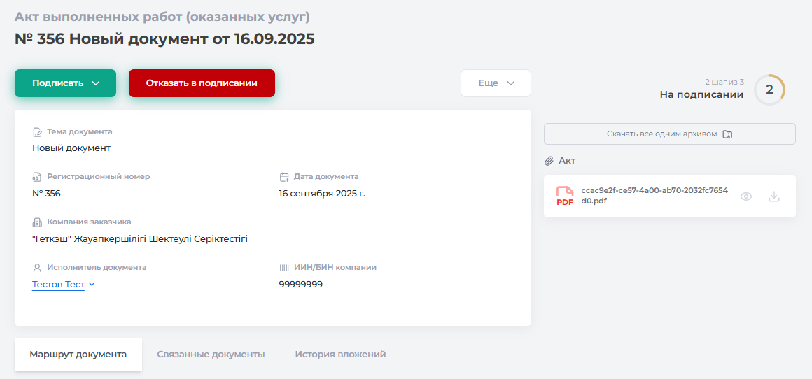 На странице документа отображаются все его реквизиты, вложения и сам файл для подписания. Пользователю предоставляется возможность (Рисунок 238):