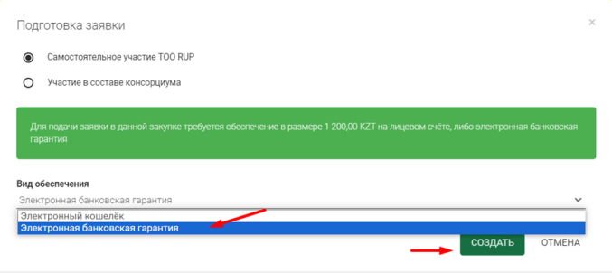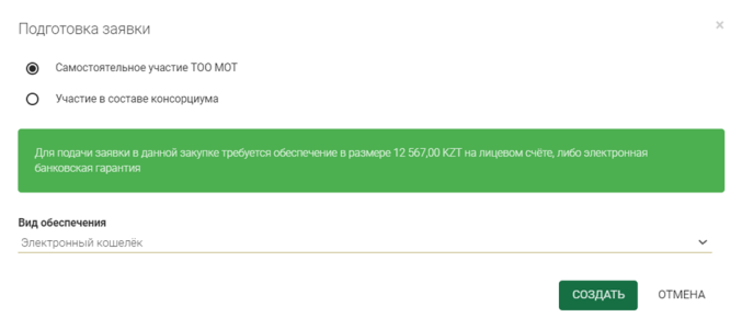 При подаче заявки на закупку способом тендера на Портале отображается модальное окно с возможностью выбора вида обеспечения тендерной заявки (электронный кошелек/ электронная банковская гарантия), а также уведомление с указанием необходимой суммы обеспечения тендерной заявки.