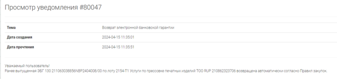 При возврате обеспечения тендерной заявки в виде электронной банковской гарантии Портал направляет уведомление сотруднику Банка, статус электронной банковской гарантии меняется на «Возвращено»