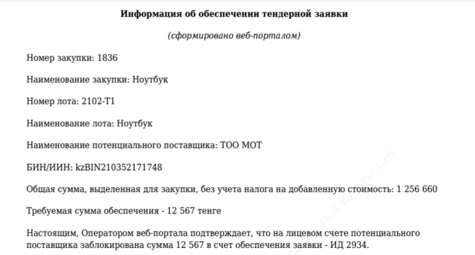 - Обеспечение тендерной заявки, вносимое посредством электронного кошелька