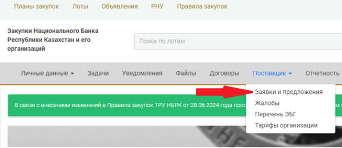 Если до вскрытия тендерных заявок поставщик принял решение об отзыве тендерной заявки, то необходимо перейти в подраздел «Заявки и предложения» раздела «Поставщик» Портала