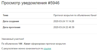 Внимание! В закупке способом «Тендер с торгами на понижение» после протокола допуска, допущенные будут приглашены в аукционный зал, все условия аукциона будут указаны в уведомлении. После завершения торгов, система автоматически сформирует протокол итогов. Поставщики получают уведомление в личный кабинет и на электронную почту.