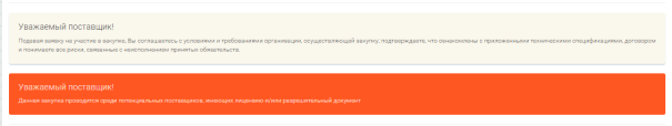 В заявке, созданной на закупку, требующую наличие лицензии, Система отображает информационное уведомление: «Данная закупка проводится среди потенциальных поставщиков, имеющих лицензию и/или разрешительный документ» (Рисунок 1).