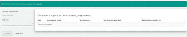 Для поиска лицензии пользователю необходимо заполнить параметры фильтрации (номер лицензии и статус лицензии) и нажать кнопку «Найти». Для сброса введенных параметров пользователю необходимо нажать кнопку «Очистить».