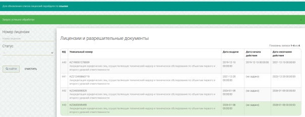 Примечание! В случае если лицензия является действующей (активной), система подсвечивает соответствующую запись зеленым цветом.