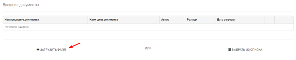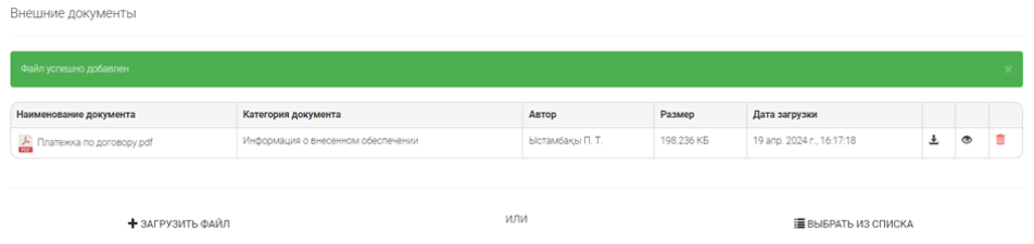 В карточке договора у поставщика есть возможность загрузить внешний документ, нажав на кнопку “Загрузить файл” в случае, если поставщик вносит обеспечение в виде платежного поручения или банковской гарантии.