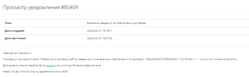 После загрузки файла Система направляет уведомление “Внесение сведений об обеспечении договора” Заказчику/Организатору.