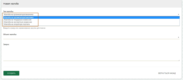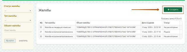 Для того что бы подать жалобу, необходимо нажать на кнопку «Создать».