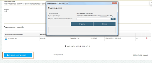 При нажатии на кнопку «Опубликовать», необходимо будет подписать жалобу ключом ЭЦП.