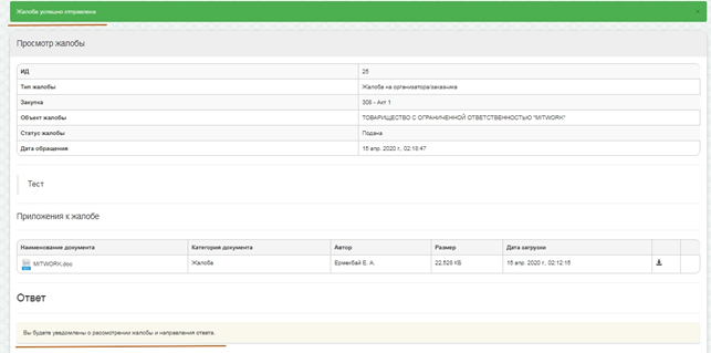Если камеральный контроль ответить на жалобу поставщика, система отобразит уведомление «Ответ на жалобу».