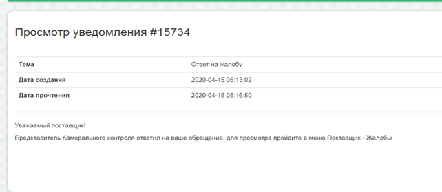 Войдя в данное уведомление, поставщику отображается информация для ознакомления «Представитель Камерального контроля ответил на ваше обращение, для просмотра пройдите в меню Поставщик – Жалобы».