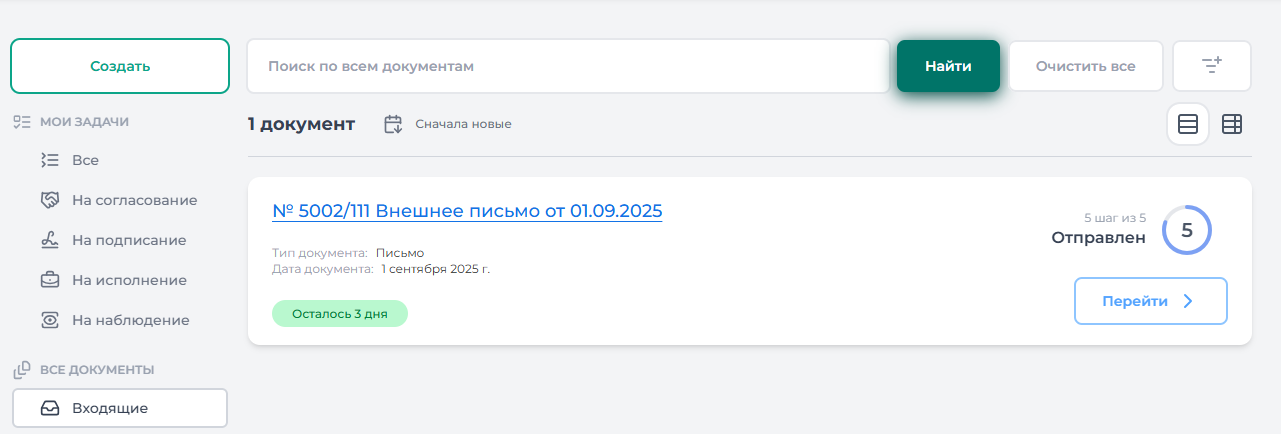 После того как Канцелярист зарегистрировал внешнее письмо, система автоматически меняет его статус на «Отправлен».