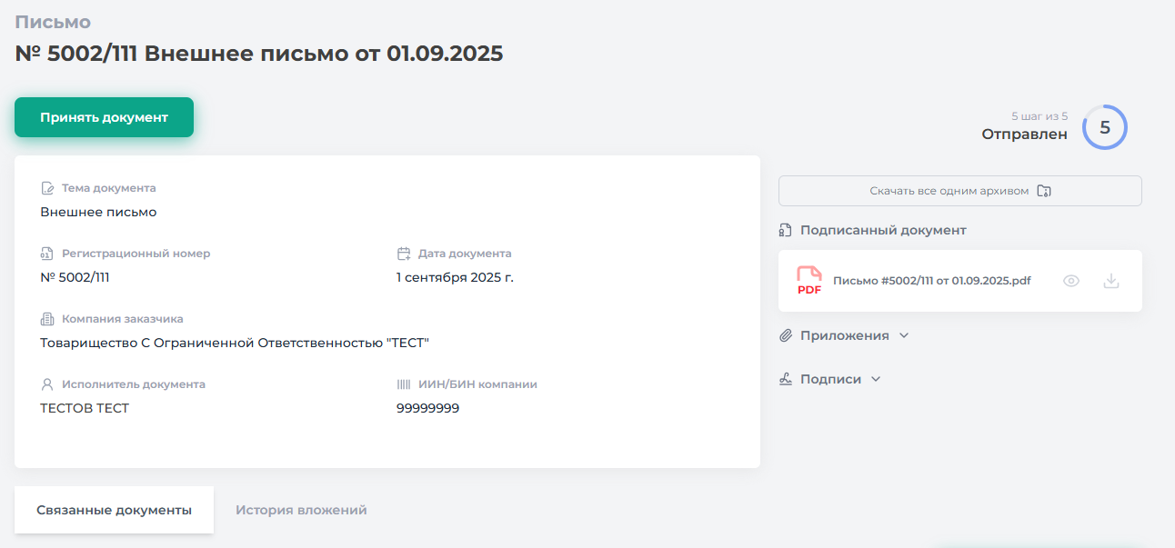 После нажатия на кнопку «Принять документ» на странице документа система меняет статус документа на «Принят» (Рисунок 83).