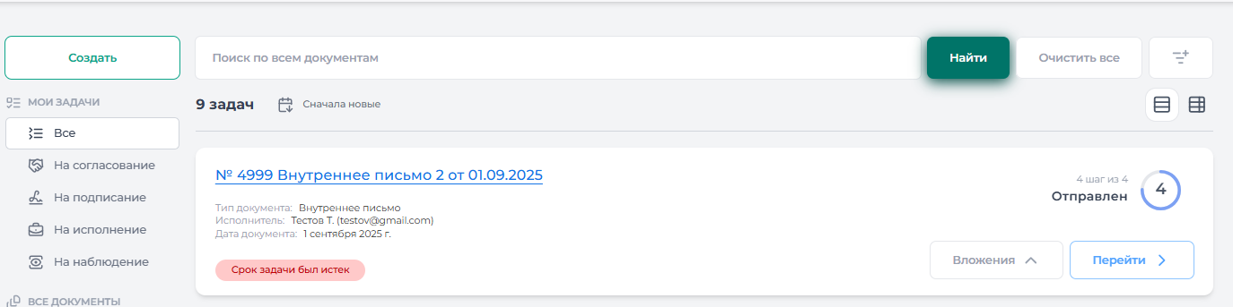 В разделе «Мои задачи» → «На исполнении» отображается список всех задач, требующих для исполнения. Для просмотра содержания документа необходимо нажать кнопку «Перейти» (Рисунок 59).