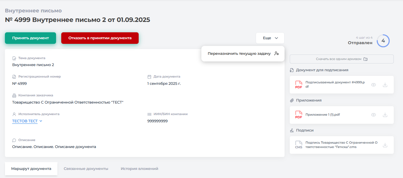 ● Отказать в принятии документа – система открывает модальное окно, где требуется указать причину отказа (минимум 20 символов). После отправки документ получает статус «Отказано в принятии» и возвращается инициатору (Автору), который может отредактировать документ и отправить по маршруту заново.