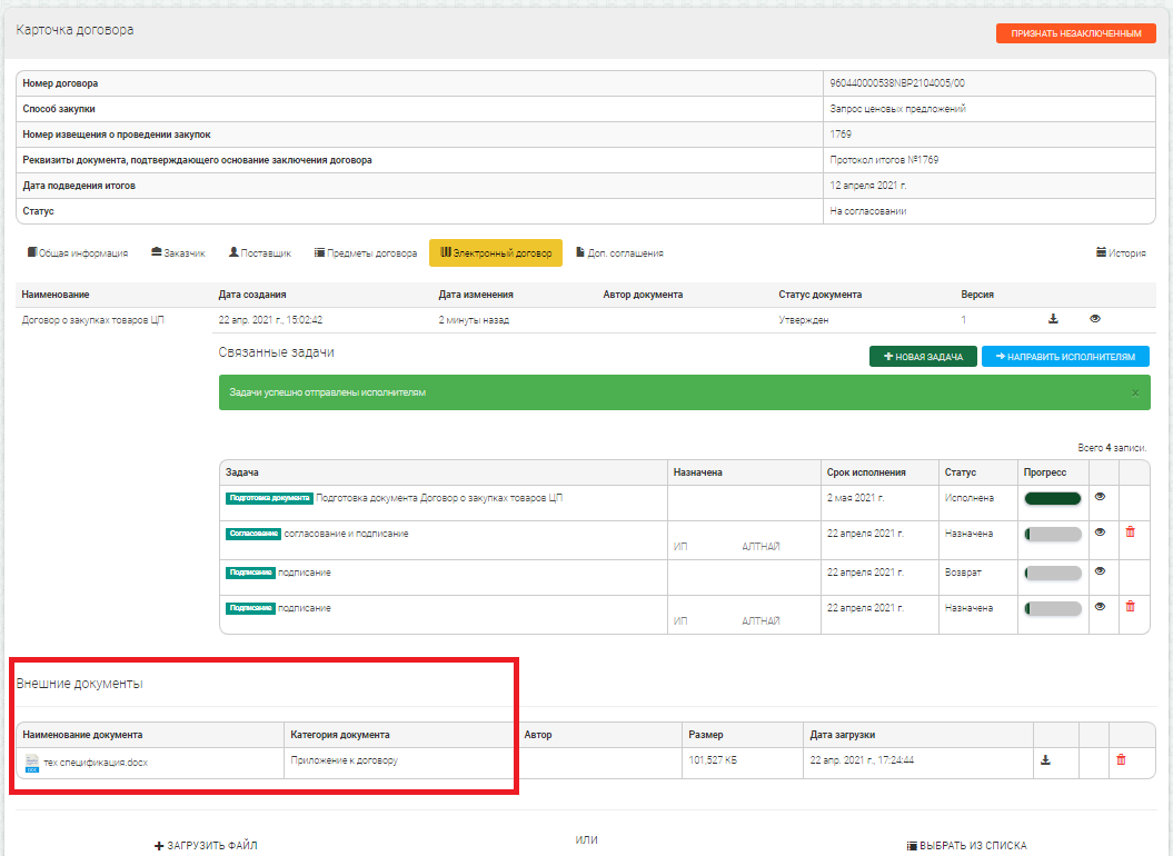При направлении поставщику на подписание электронного договора, сформированного на портале закупок, у Организатора закупки имеется возможность в Карточке договора в разделе «Внешние документы» прикрепить файл с технической спецификацией, содержащей более лучшие характеристики.