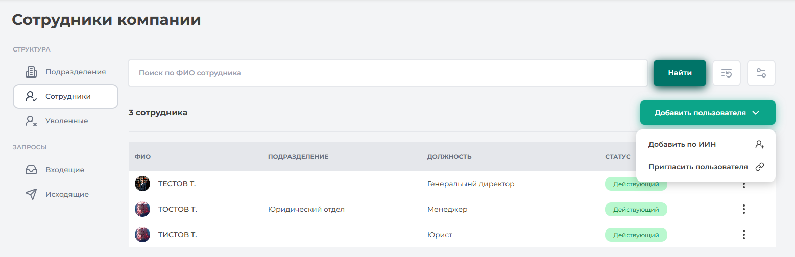 ● Добавление пользователя – по ИИН и по приглашению (см. п. 5.4.1 Подразделения)