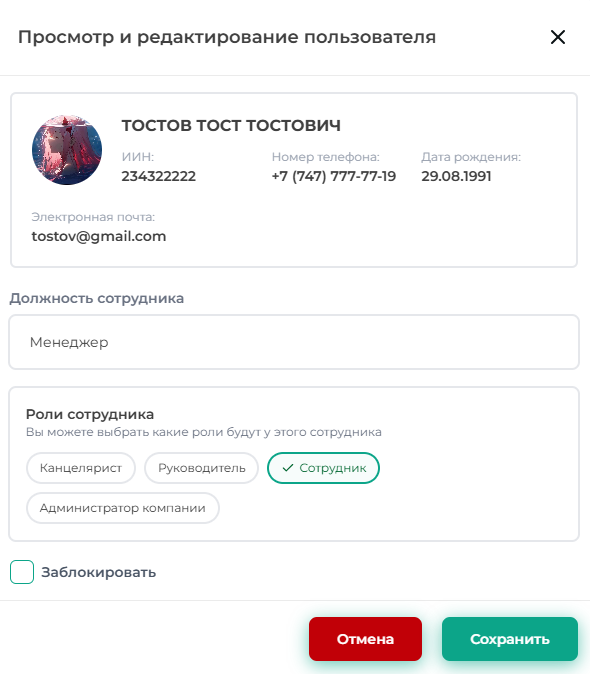 ● Просмотр и редактирование сотрудника – При выборе действия «Посмотреть» система открывает карточку сотрудника (Рисунок 35), с возможностью редактирования, присвоения ролей (Канцелярист, Руководитель, Сотрудник и Администратор компании) и блокировки (Рисунок 36).