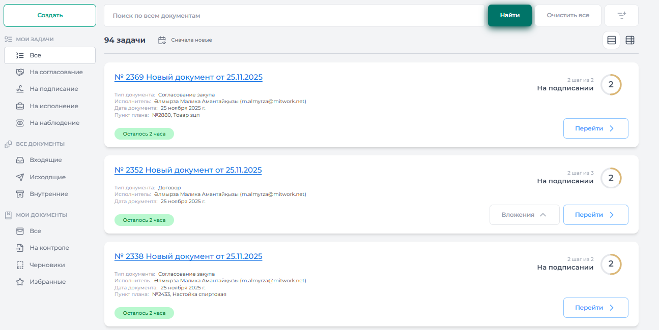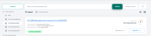 В разделе «Мои задачи» → «На подписание» отображается список всех задач, требующих подписи. Для просмотра содержания документа и перехода к подписанию необходимо нажать кнопку «Перейти»