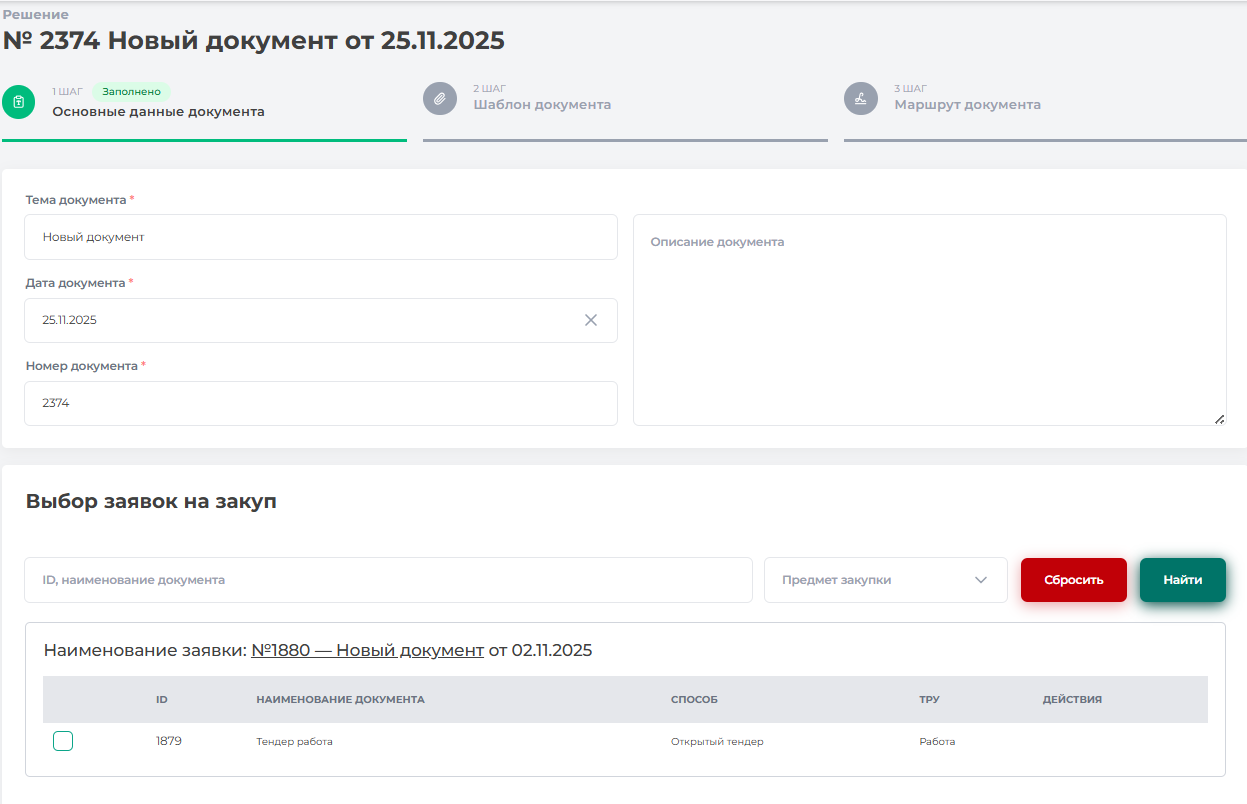Данная страница предназначена для поиска и выбора заявок на закуп по параметрам ID- документа, наименования документа и предмет закупки.