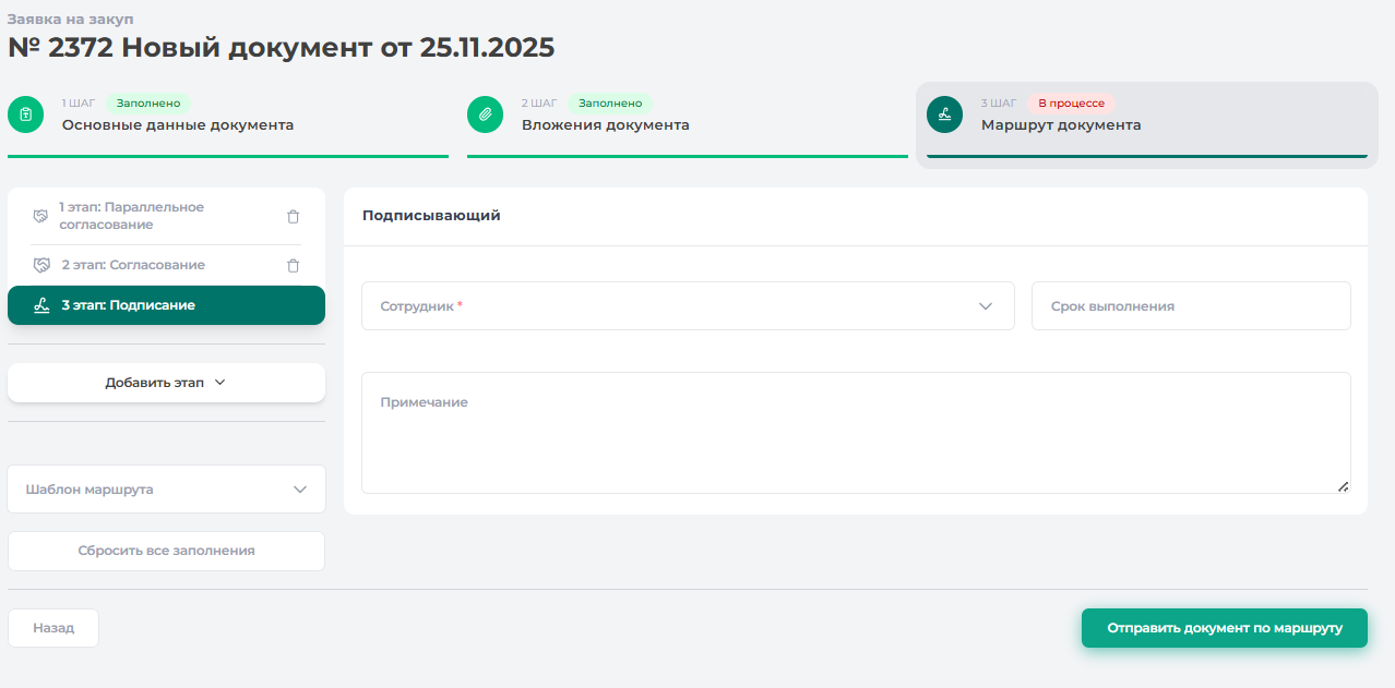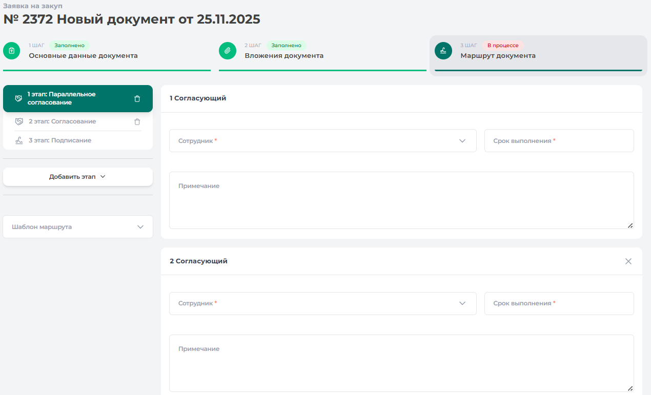 При необходимости вы можете добавить дополнительный этап согласования, нажав кнопку «Добавить этап». Для каждого этапа обязательно указывается (обязательные поля отмечены * ):